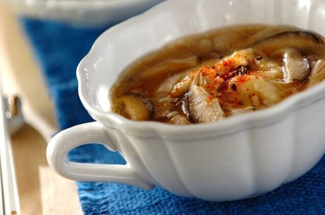 辛さと酸味のバランスがたまらない、きのこのサンラータン。しょうががたっぷり入り、体もポカポカ温まるスープです。ご飯を加えて、雑炊にしてもおいしいですよ。
