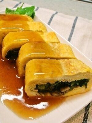 まいたけとニラを巻き込んだ、具だくさんの卵焼き。ふんわりとした卵に、ニラとまいたけの風味や食感がよく合います。卵に火が通ったら弱火に調節するのが、きれいに巻くためのポイントです。