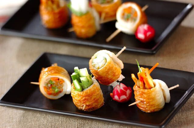 ちくわを縦にカットして開き、きんぴらやだいこん、きゅうりなどお好みの具を巻いて楊枝で刺したおしゃれな一皿。なかに巻く食材をいろいろアレンジしても面白そうですね。