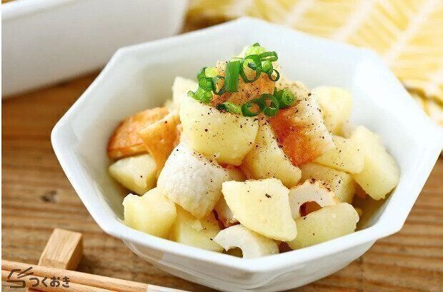 ちくわとパンを組み合わせたちくわコロネです。パンの中には、カレー味のポテトが入って食べ応え抜群。余ったポテトサラダは、トーストにトッピングしたり、パンにはさんで食べたりリメイク料理を楽しむこともできます。