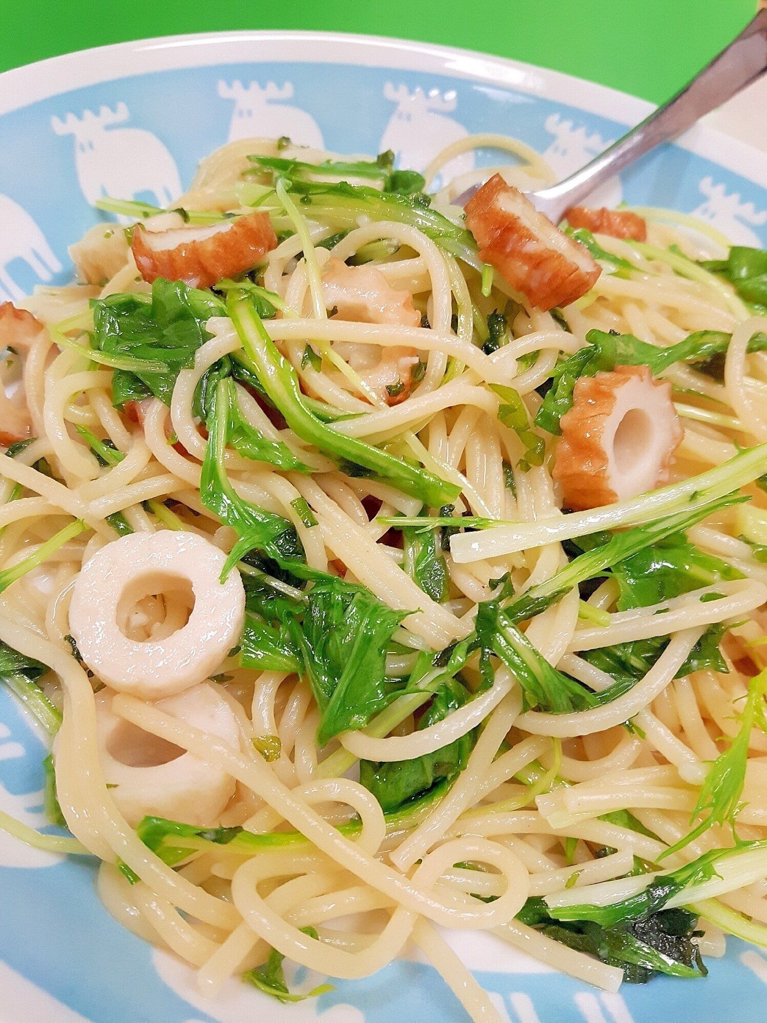 ピリ辛のゆずこしょうがアクセントになった、水菜と大葉のパスタ。水菜のシャキシャキ感とちくわの歯応え、両方の食感を楽しみながら食べられる一品です。大葉の香りで食欲もアップ。