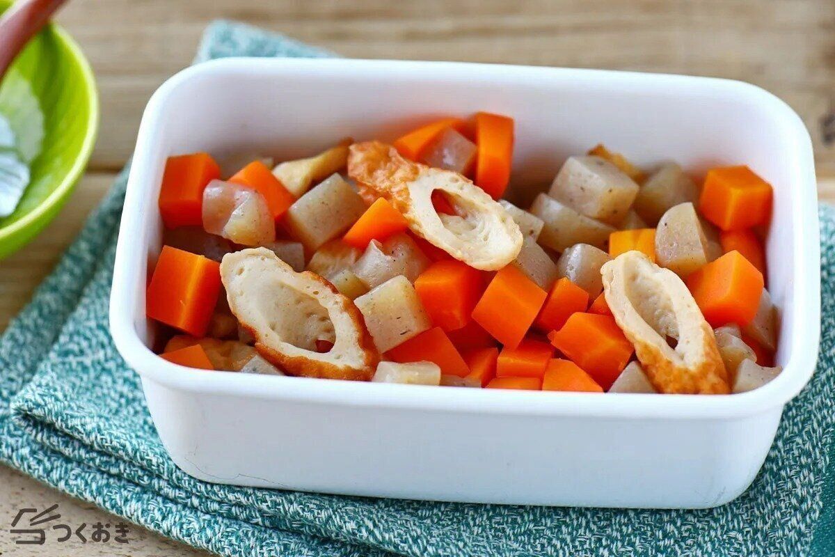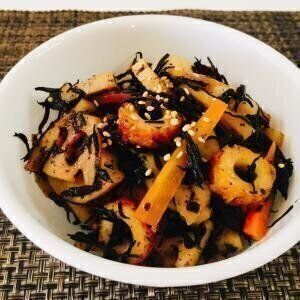 ちくわを使ったひじきの煮物。れんこんのシャキシャキとした食感と、ちくわのふわっとした柔らかい食感がたまりません。ちくわ、れんこん、にんじんと具だくさんで、食べ応えも抜群です。