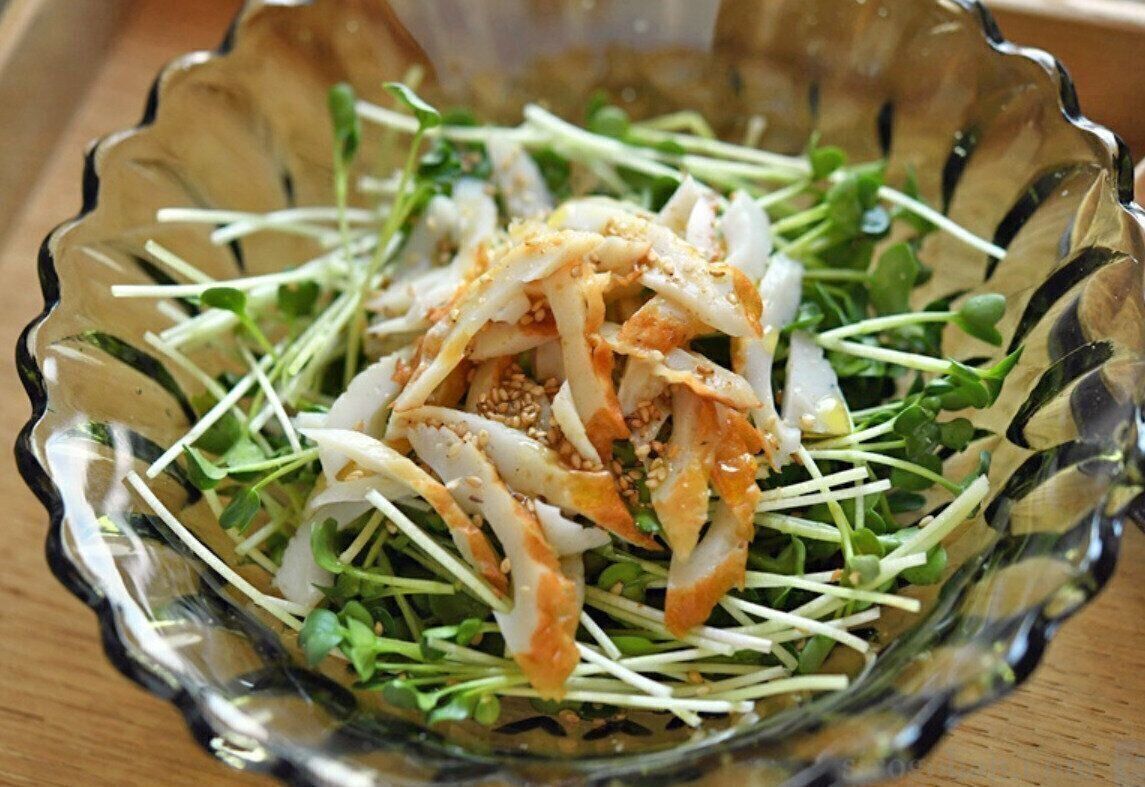 シャキシャキ感が楽しい豆苗と柔らかいちくわを組み合わせた、さっぱりしたごま酢あえのレシピ。季節を問わずスーパーで手に入る食材なので、いつでも安くつくれるのもポイント。