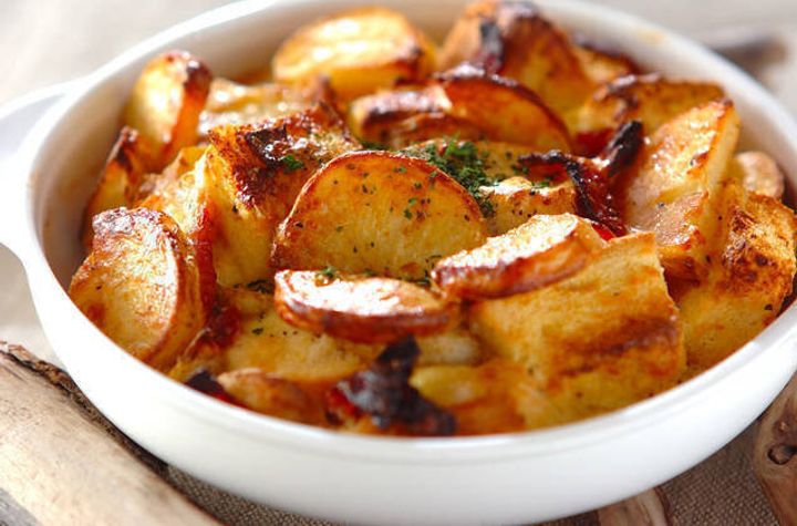 食パンとじゃがいもを使った、具だくさんなグラタン。カリカリに焼けた具材の食感と、カレー粉や黒こしょうのスパイシーな味つけが後引くおいしさです。豪華な見た目で食べ応えもあるので、おもてなしやパーティーメニューに最適です。
