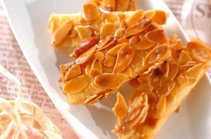 電子レンジで乾燥させた食パンに、バターやはちみつとからめたスライスアーモンドをのせて焼くだけ!ほのかな甘みのアーモンドと、サクサクカリカリのラスク食感が楽しいデザートレシピです。小さめサイズで片手で食べられるので、ホームパーティの手軽なおやつにもよさそうですね。
