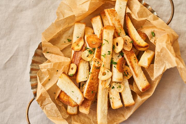 余った食パンの耳とにんにくを炒めて、おつまみ風のラスクにアレンジ。にんにくとパセリがたっぷりのって、見た目・香り・彩りも◎。サクサク・カリカリの食感と、パンチのきいたにんにくの風味で、お酒が進むこと間違いなしですよ。