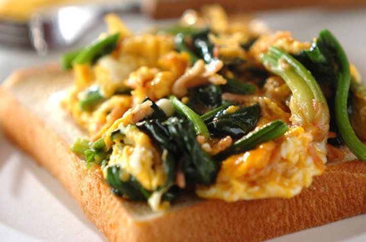 春らしい菜の花トースト。塩とオイルで苦みをまろやかにしていただきます。ピザ用チーズがほどよいボリューム感とコクをプラスしてくれそうですね。こんがりと焼いて朝ごはんにどうぞ。