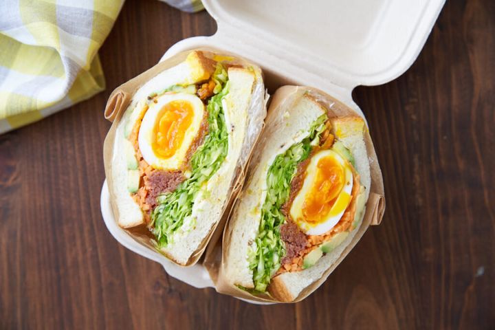 ヨーグルト、にんにく、カレー粉などに漬け込んだ鶏肉をじっくりと焼いてはさんだサンドイッチです。食欲をそそる香りで、周りの目を気にせずガツガツと豪快に食べたくなってしまうかも⁉大きめのワックスペーパーに包むと、具材のこぼれを気にせず食べやすくなりますよ。