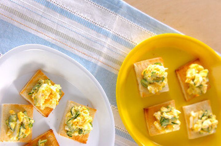 マヨネーズとあえた炒り卵をのせるだけ、調理時間10分以下でつくれる簡単オープンサンドレシピです。仕上げに加えた黒こしょうがよいアクセントに。マヨネーズと卵のうま味を引き立ててくれますよ。お好みで、きゅうりやハムなどの具材と合わせるのも◎。