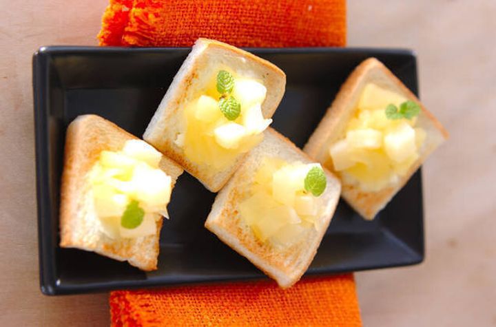 食パンを1/4サイズに切って焼き上げてくる、カナッペ風の一品です。トーストのカリカリ感を生かすため、具材をのせるのは食べる直前がおすすめ。ガーリックパウダーを多めに入れて、おつまみにも◎