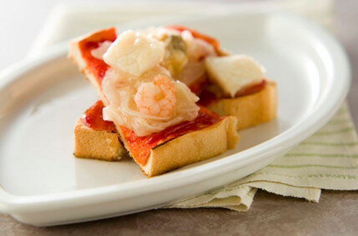 豆板醤、ケチャップ、鶏がらスープで煮込んだシーフードにとろみをつけ、トーストの具材にアレンジ!辛さとうま味が染みこんだトーストは、やみつきになること必至です。ごま油を仕上げに垂らすと、さらに食欲アップが期待できますよ。