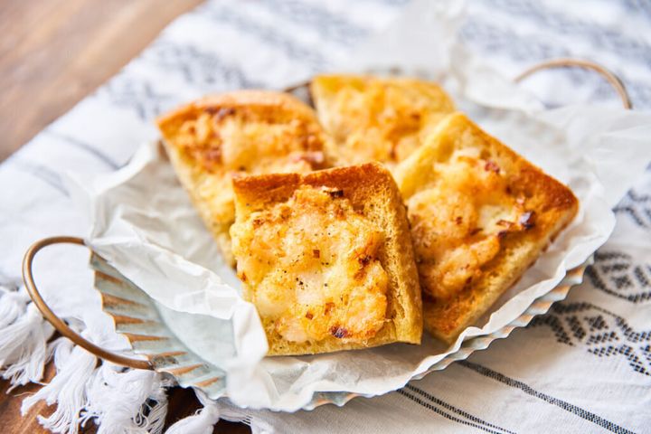 揚げ食パンのサクサク食感と、エビのぷりぷり感がクセになるエビトースト。マヨネーズと塩でシンプルに味つけることで、エビ本来のうま味を楽しめます。お酒のおともとしてはもちろん、子どものおやつにもよさそうですね。
