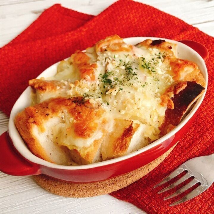 厚切り食パン2枚を器代わりにした、パングラタンのレシピ。とろりと溶け出すホワイトソースが、食欲をかきたてますね。こんがりきつね色に焼いたパンに、ホワイトソースをたっぷり絡めて食べましょう。