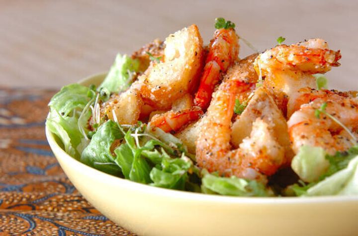 フライパンでつくれるえびトースト。食パンを揚げ焼きにしたサクサク食感もポイントです!味つけにこしょうやにんにくを使っているので、おつまみにもぴったりですよ。