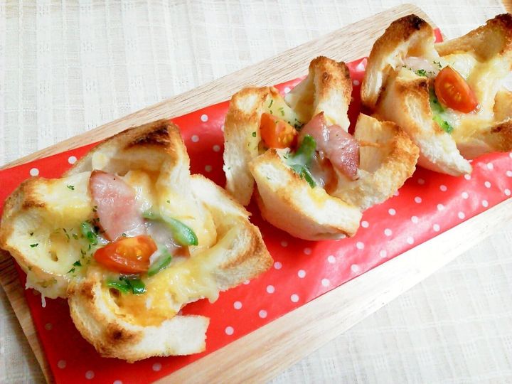 サンドイッチ用食パンでつくったカップに具材をのせて、キッシュ風に仕上げた一品。かわいらしく食べやすいので、パーティーやおもてなしに喜ばれそう!中に入れる具材を、好みでいろいろアレンジできるのもいいですね。