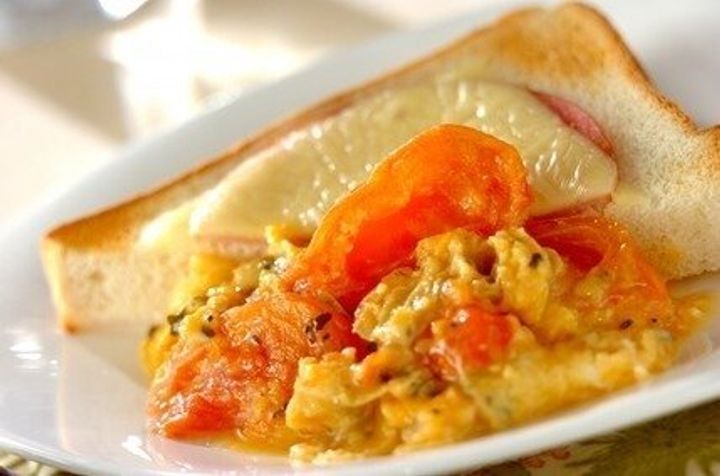 ハムとチーズで焼いたトーストに、トマト入りのオムレツをのせた栄養バランスがとれた一品です。トマトの水分を炒めて飛ばすことで、うま味と甘さが凝縮されます。朝の元気チャージに取り入れてみてくださいね。