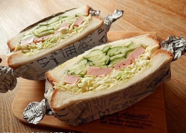 4.ラップの上にパン、キャベツ、きゅうり、ランチョンミート、パンの順に重ね、ラップでしっかり包みます。半分に切ったら完成♪