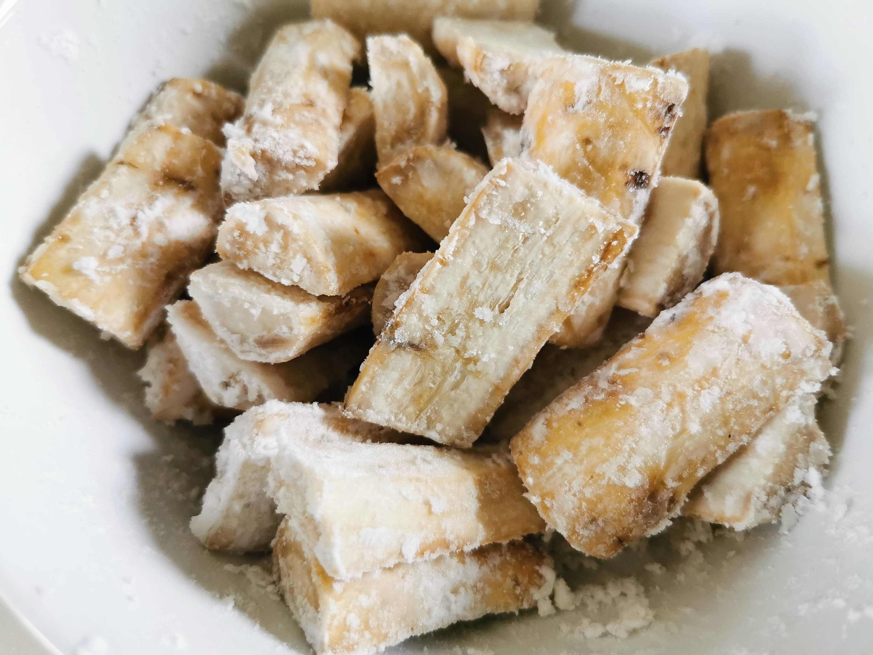 2.水気を切って、片栗粉をまぶし、フライパンに揚げ油を入れて加熱し、ごぼうを揚げる。