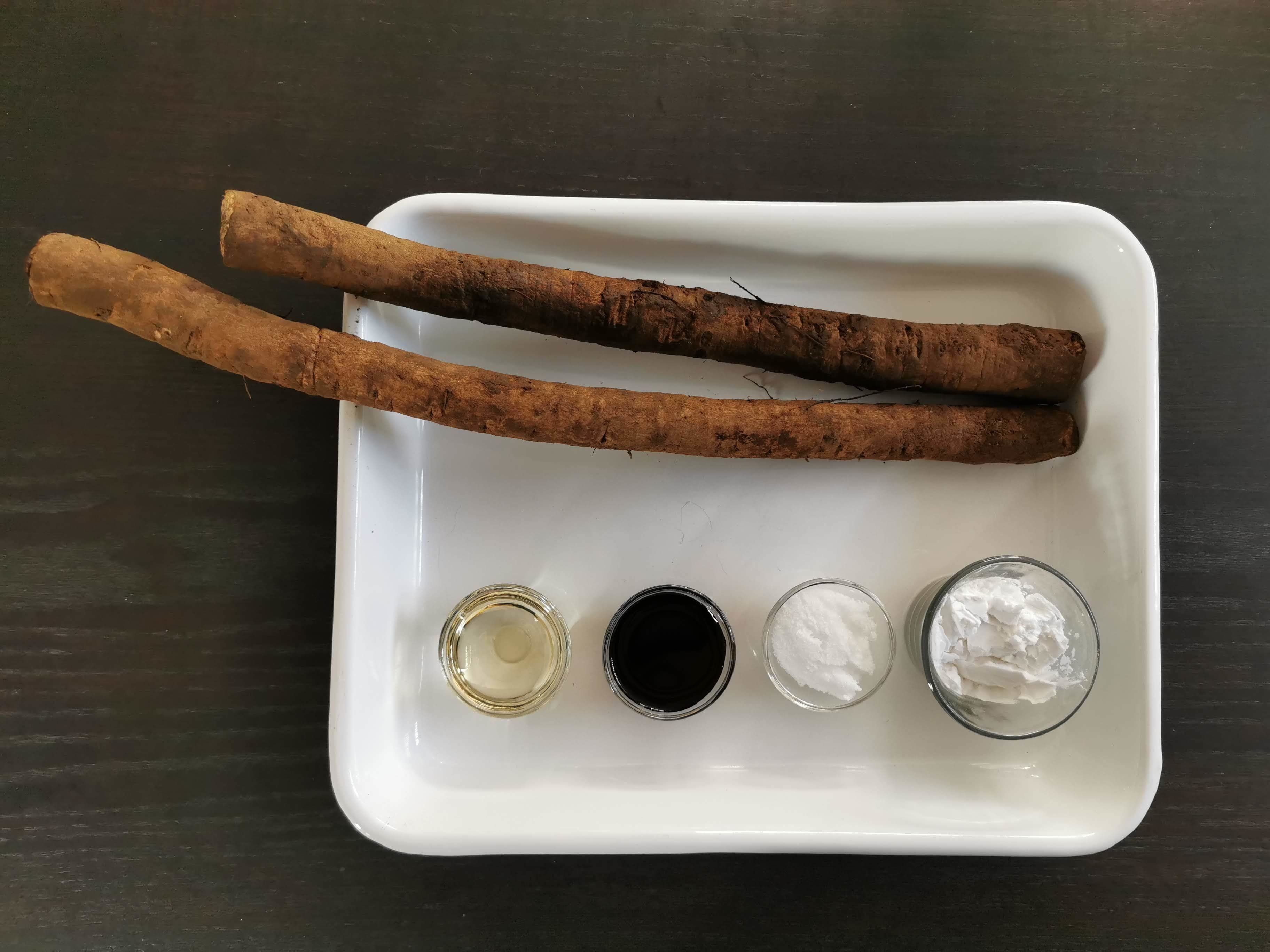 1.ごぼうは5cmくらいの長さに切り、さらに縦半分に切って酢水につけておく。