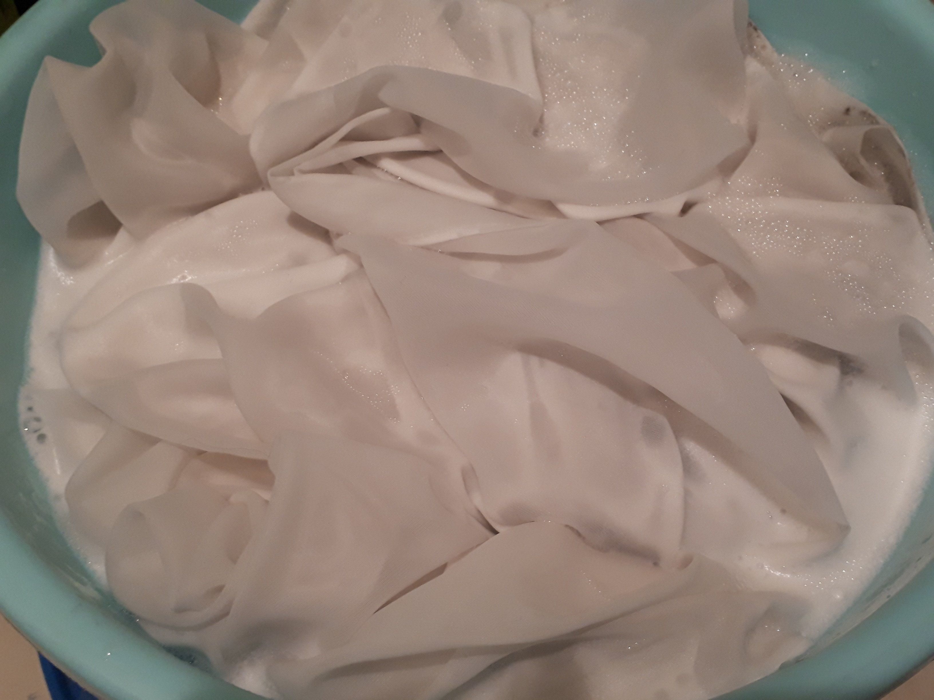 オキシクリーンの公式HPにありますが、オキシクリーンは40~60℃のお湯で使うと効果的(やけどに注意!)なので、50℃のお湯にオキシクリーンを溶かしてオキシ漬けしました。写真のバケツは容量8.3Lのバケツで、手袋をしてから、お湯7L程度にオキシクリーンを備えつけスプーンの1/2杯入れて溶かし、レースカーテン1枚を入れました。その後保温のためバケツにふたをして30分ほどつけおき。