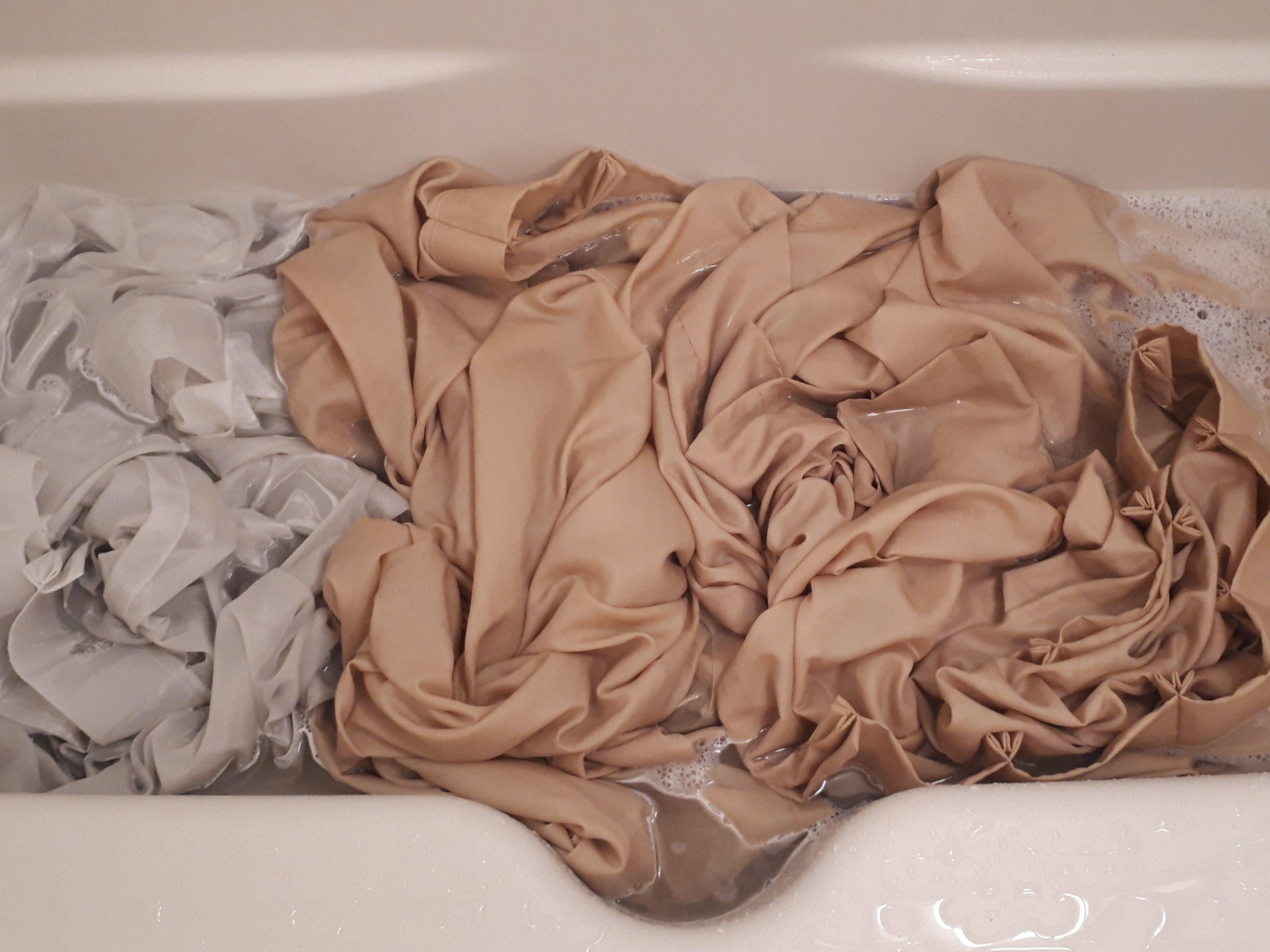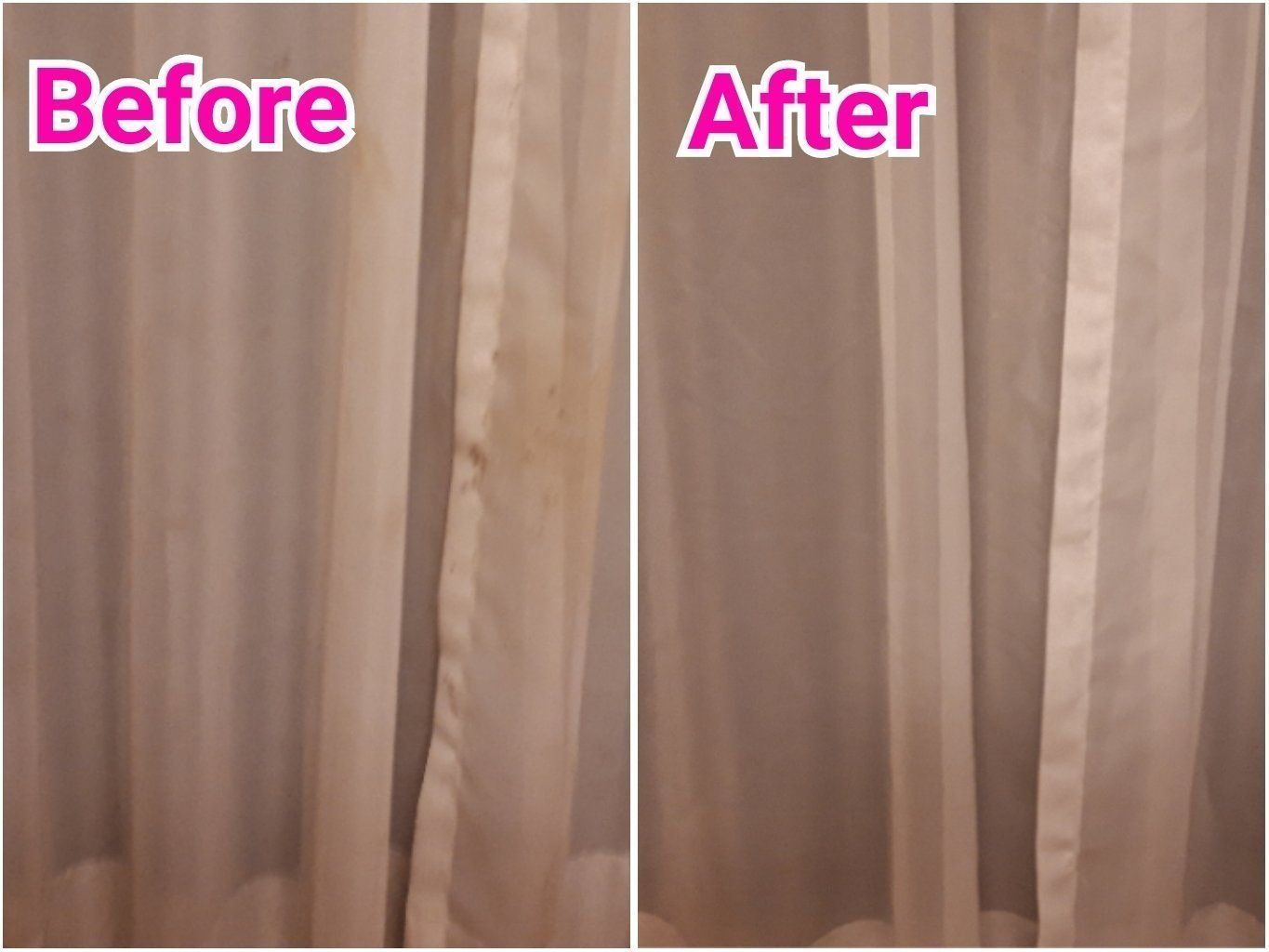 「もうダメかな」と思っていたとっても汚いカーテンが30分~1時間のオキシ漬けでこんなにキレイになりました。
