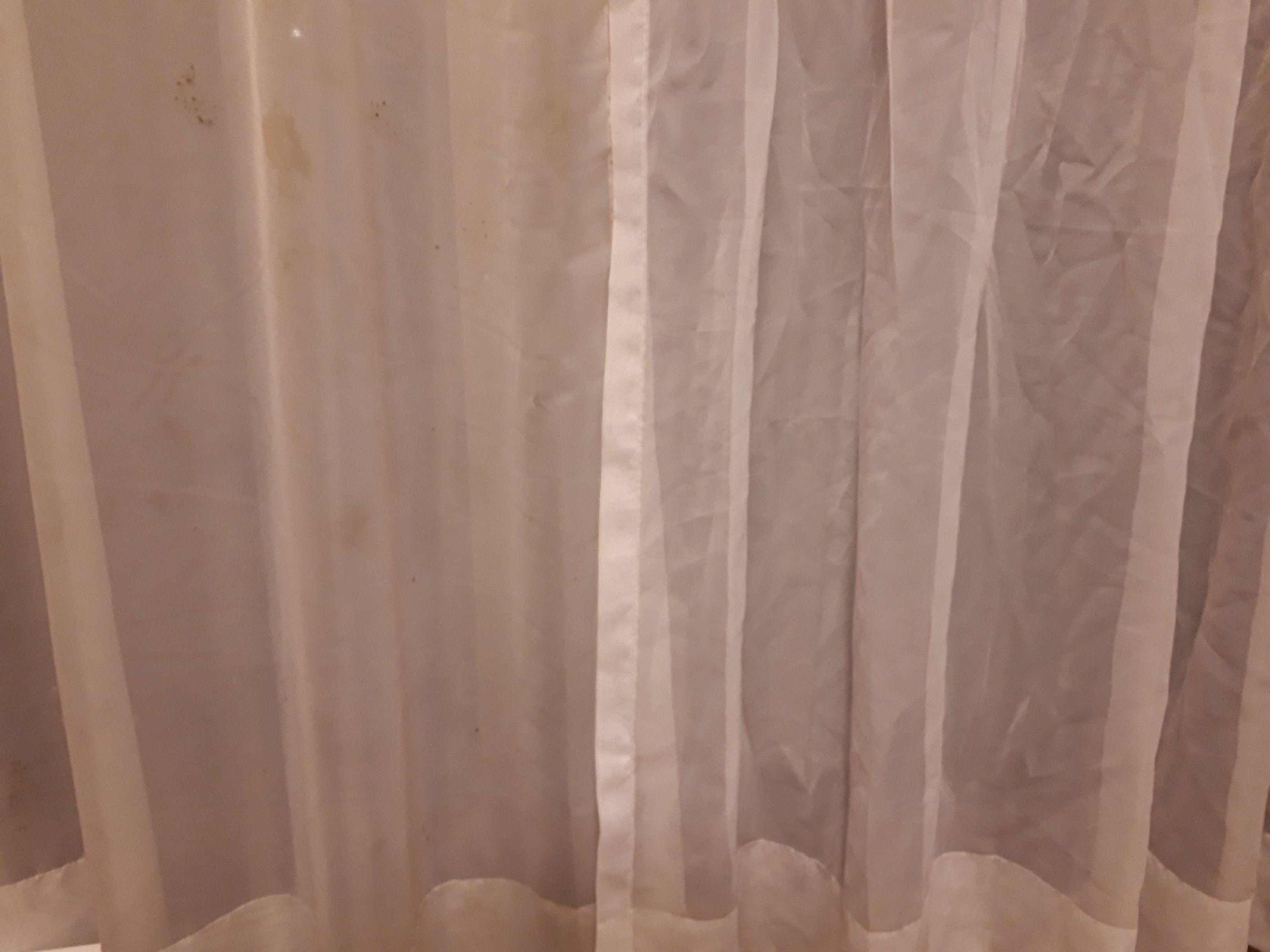 トップ写真の黒カビやシミだらけの汚いカーテン、とっても恥ずかしいのですが、私が5年間見て見ぬふりをし、放置していたわが家のカーテンです。