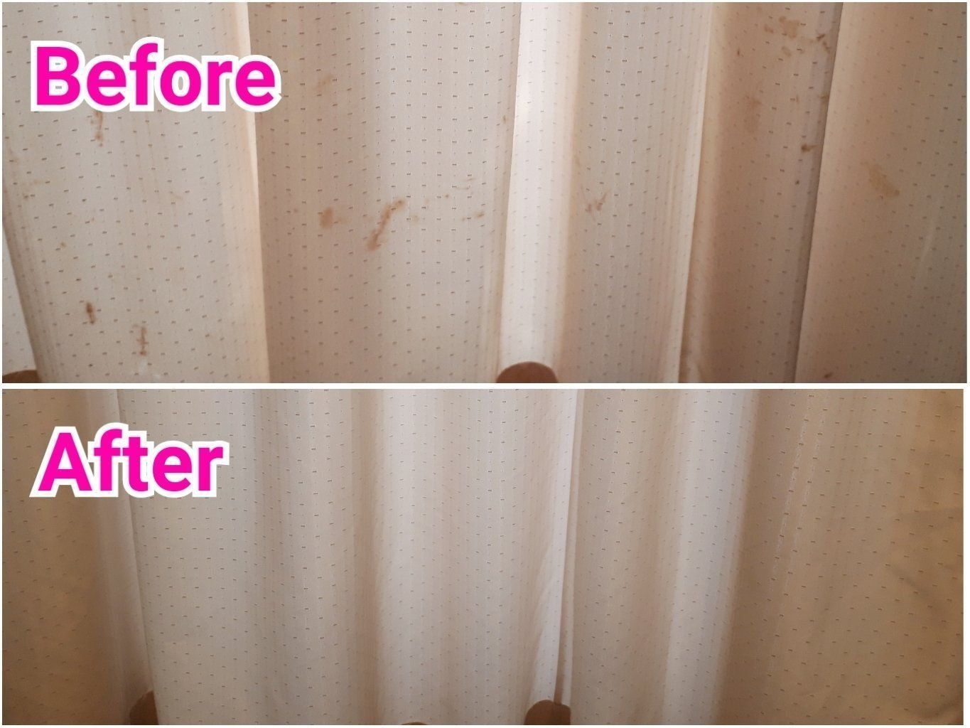 つけおき後はやはりほとんどの汚れが落ちていて、少しだけ残っている汚れも擦るだけでとれました!お試しのときと同様に、かるく絞って洗濯機にイン。ソフト洗いのモードで洗濯し、終了後は元のカーテンレールにかけて乾燥させました。