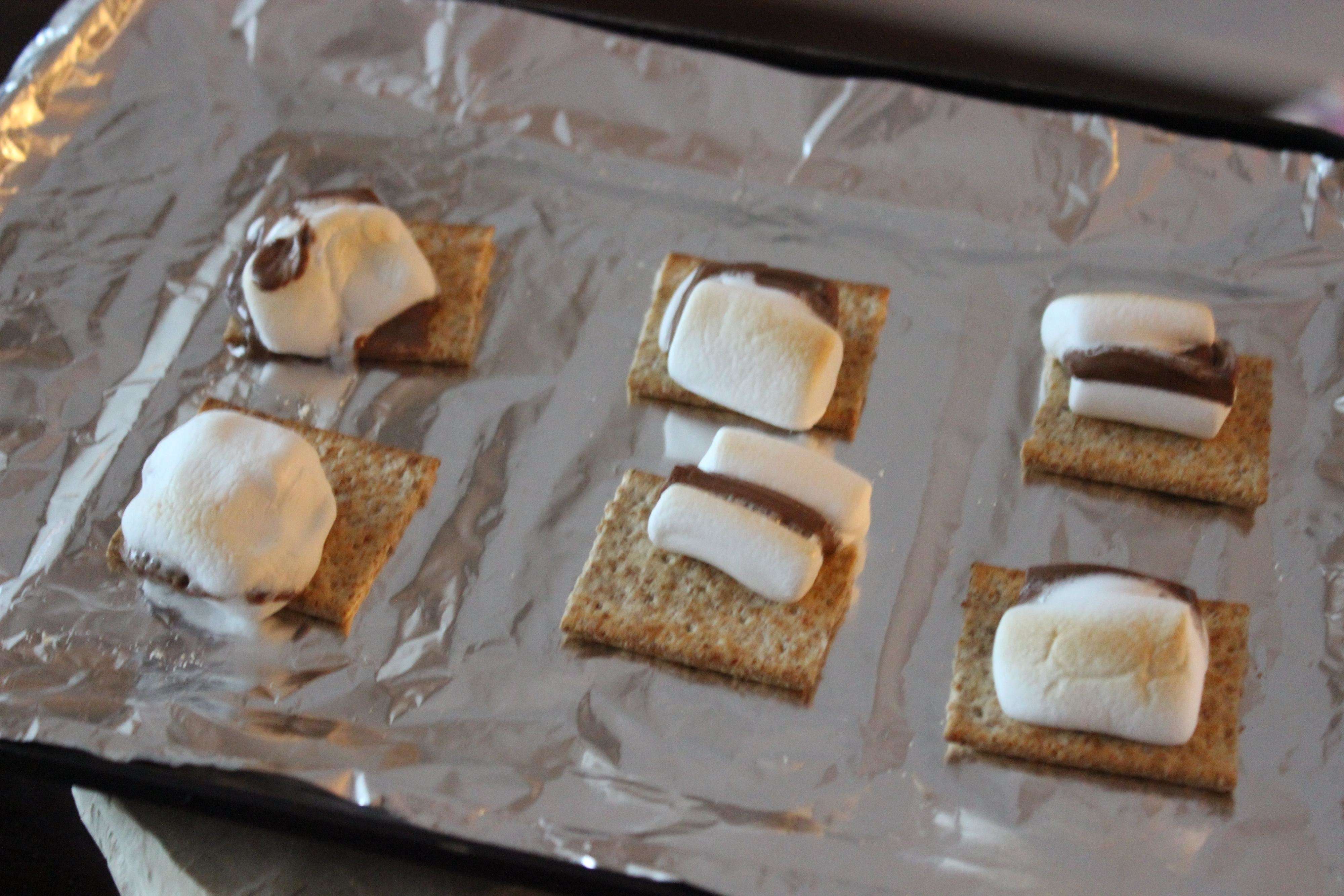 3.魚焼きグリルに入れ、弱火で1~2分焼きます。ほんのり焼き色がついてマシュマロがとろーんとしたら、クラッカーで挟んで完成。アツアツをとろーりさせながら食べましょう!