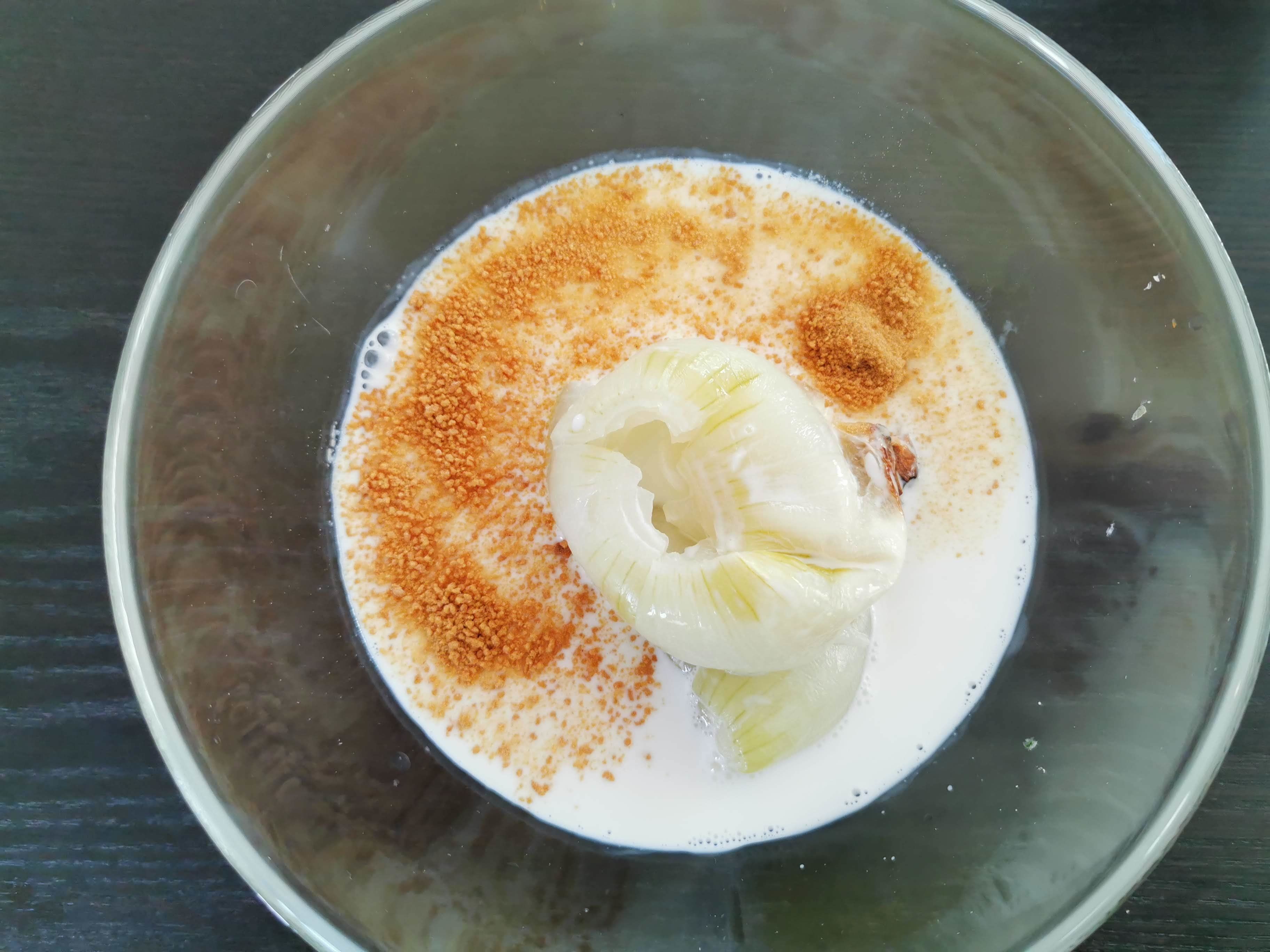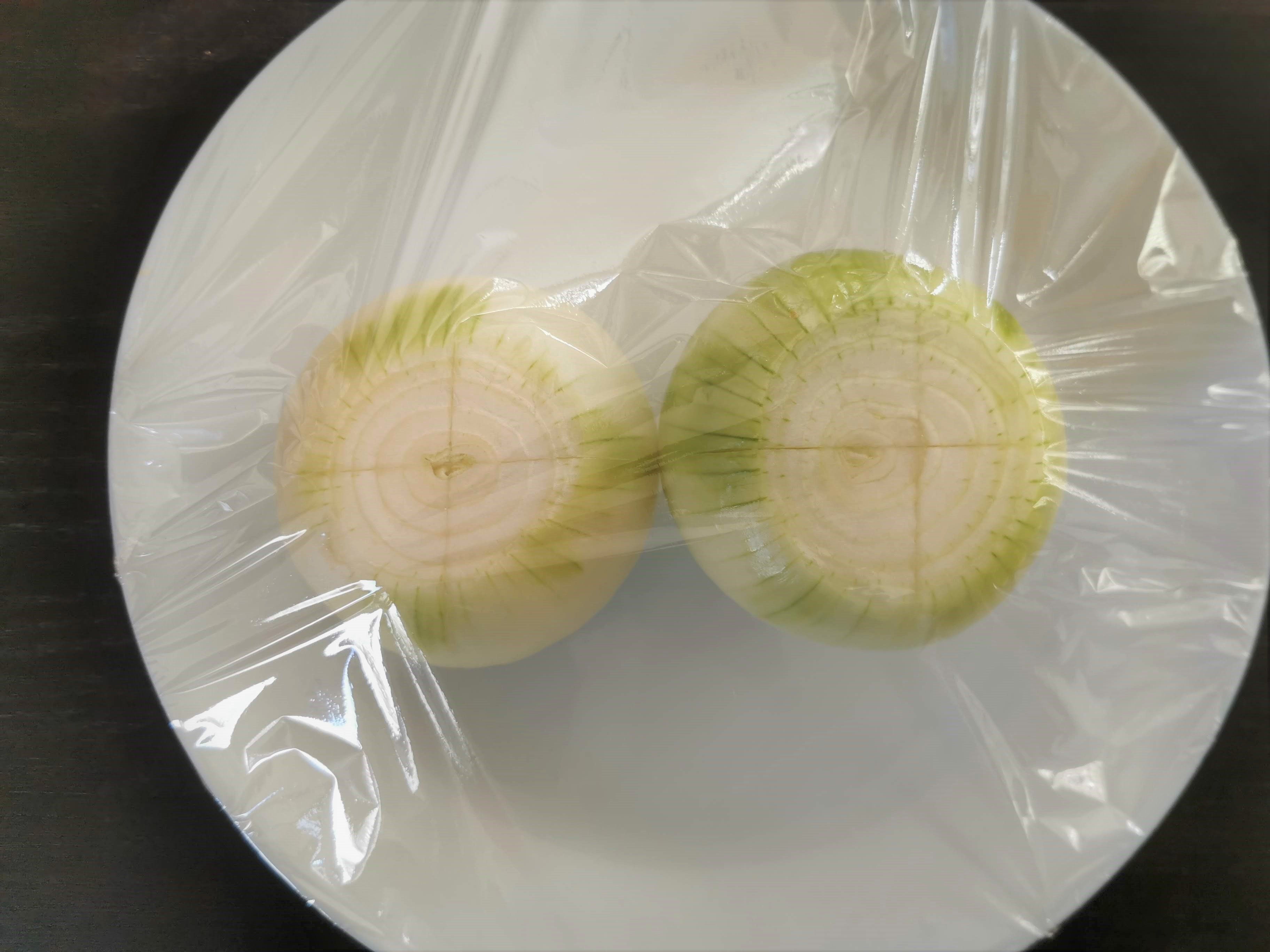 (1)玉ねぎは皮を剥いて、上下きりおとし、十字の切れ目をいれる。