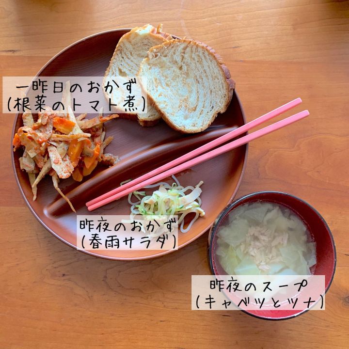 次の日の朝、盛りつけて朝食のおかずとして出します。朝はパンか前日のご飯をおにぎりにして食べるので、前日の副菜と一緒に食べればそれだけで立派な朝ごはんです。朝ごはんのために調理をする必要はありません。残しておいた汁物を朝ごはんにプラスすれば、完璧です。