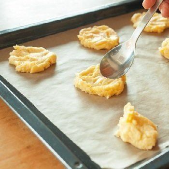 天板にオーブン用シートを敷く。(1)を1/8量ずつ2本のスプーンですくい、オーブン用シートの上に間隔を空けて落とす。スプーンの背で直径7cmの円に広げ、180℃に予熱したオーブンで12分焼く。