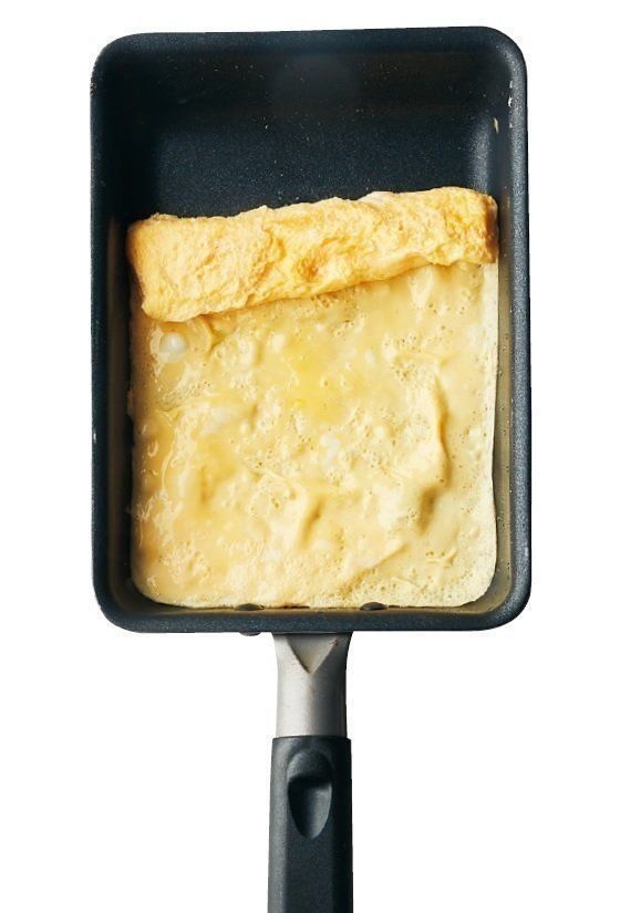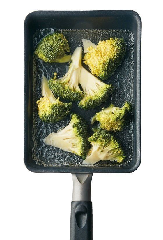 卵焼きがキレイに巻けるだけでなく、ゆで野菜やメインのおかずもこれひとつで作れて、洗い物も少なくてラク!なければ、フライパンでOK。フライパンの場合は卵焼きは、いり卵にして。