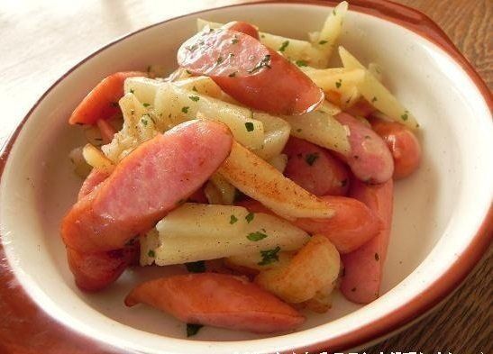 3.焦げ目がついたらウィンナーを入れて炒め、塩こしょうで味付したらパセリを散らして完成。
