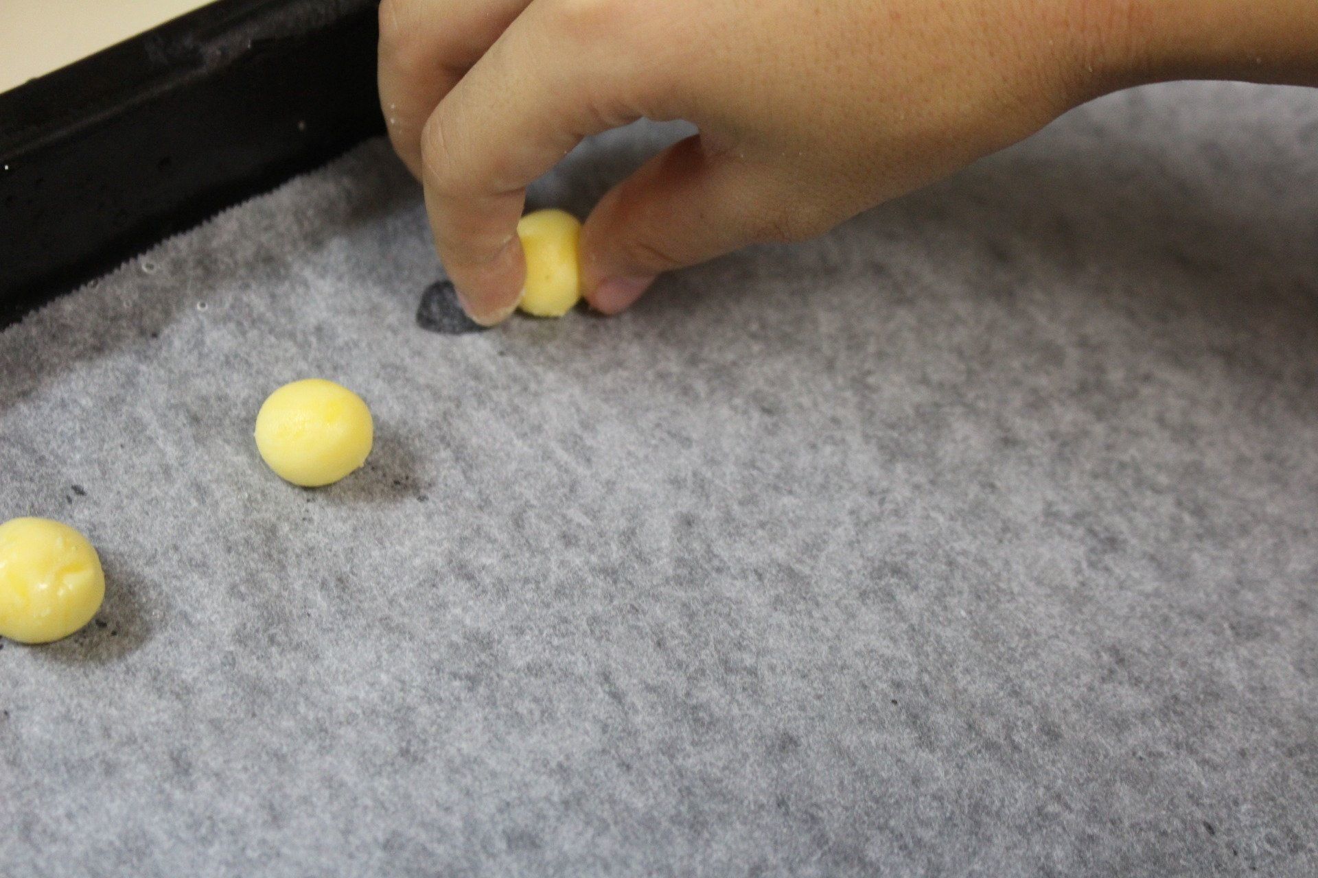 (4)オーブンを170℃に温めておき、丸めた生地を間を開けてオーブンペーパーの上に並べていきます。