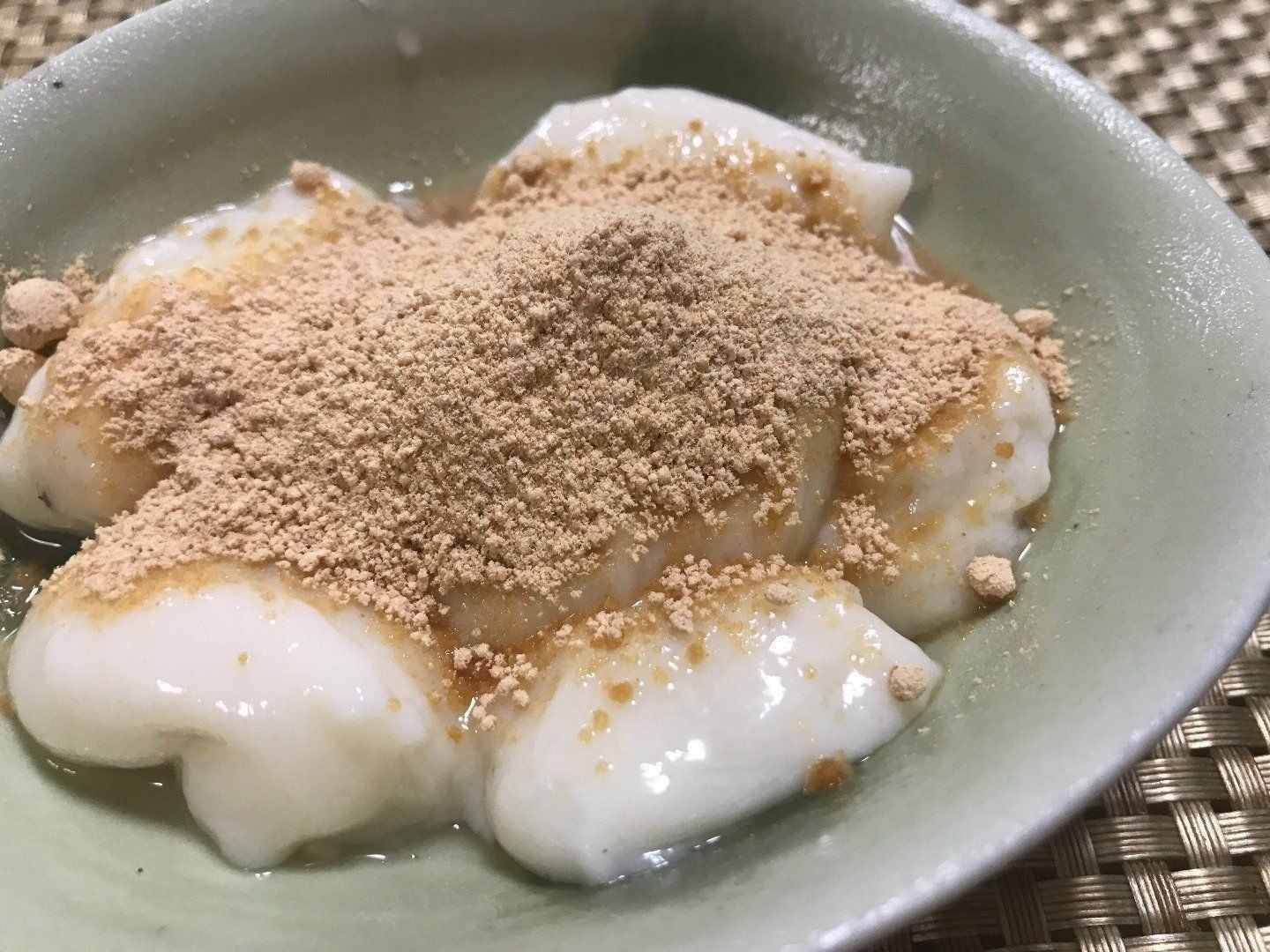 (2)粗熱が取れたら一口大にちぎってそのまま氷水で冷やし、お好みできな粉砂糖やきな粉と黒蜜、あんこなどといっしょに召し上がってください!!ぷるんとおいしいおやつになりますよーー!!