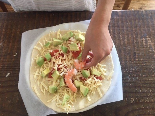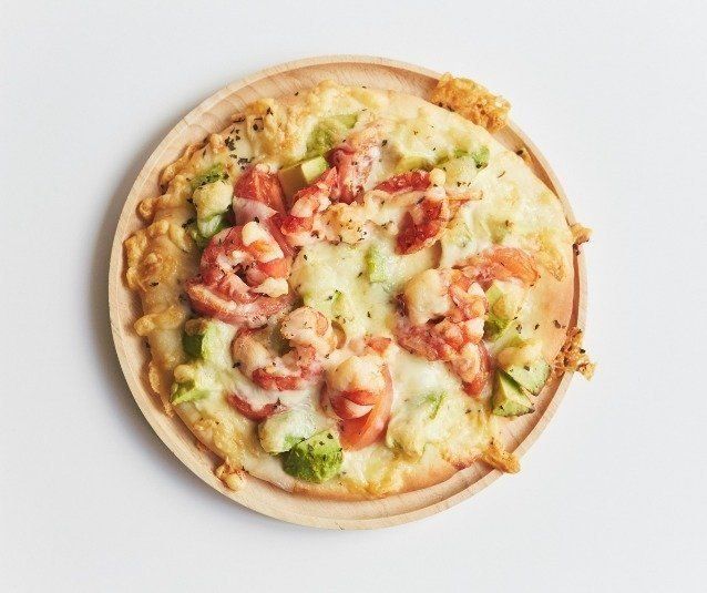4.生地を2等分し、打ち粉をふった作業台にのせてめん棒で直径20cm大に丸くのばす。アボカド、トマト、えびをのせてチーズを散らし、あればバジルをふって、250℃に予熱したオーブンで10分焼く。