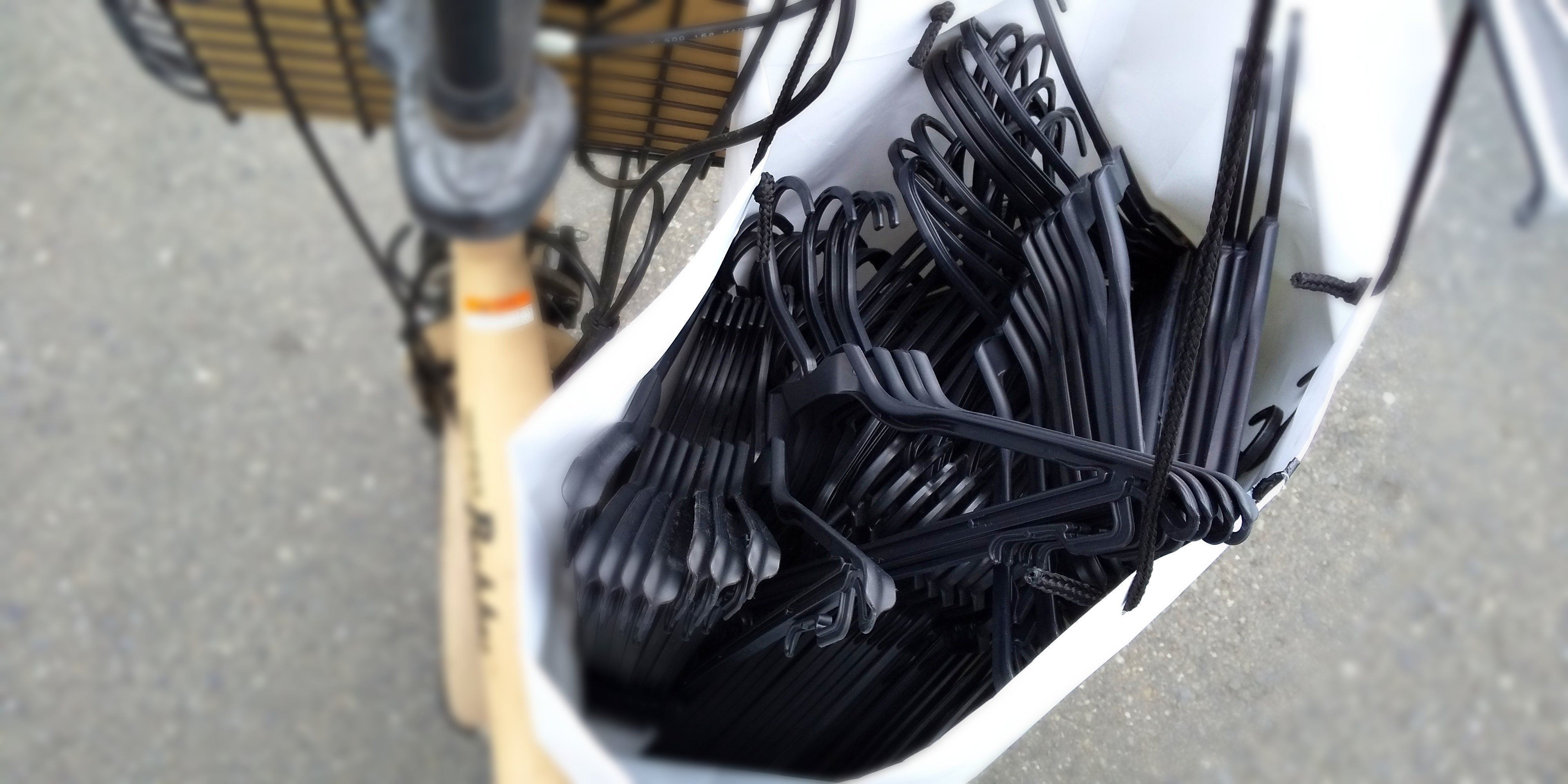 引っ越し荷物に含めるものと、処分するものに分けていくうちに、クリーニング店の黒いハンガーがかさばってきました。即席クローゼットの半分ほど片づけたところで、我が家にある一番大きな紙袋に収まらなくなっていったのです。