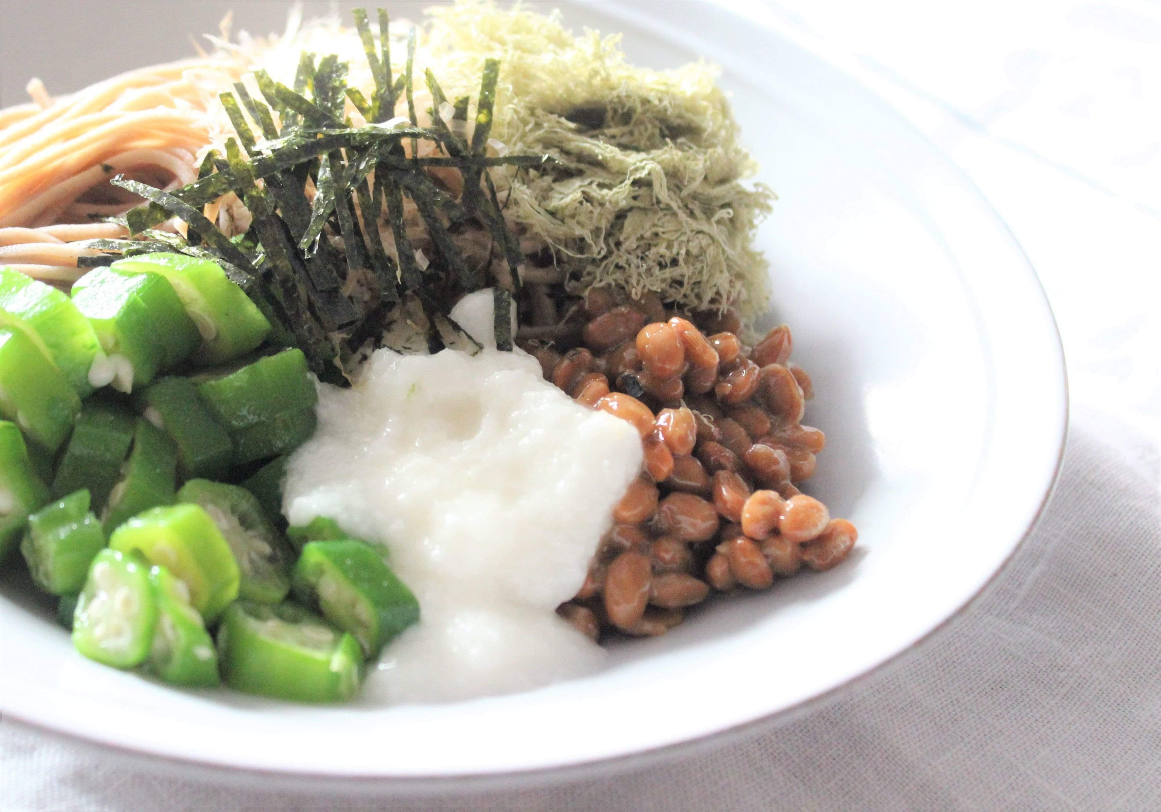 蕎麦をゆでて流水で冷やし、解凍したきざみオクラ、山芋とろろ、付属のたれで味つけした納豆、おぼろ昆布、きざみ海苔を乗せて麺つゆをかけるだけで、野菜、タンパク質(納豆)、炭水化物(蕎麦)が一度にとれる、ヘルシーランチになりました。