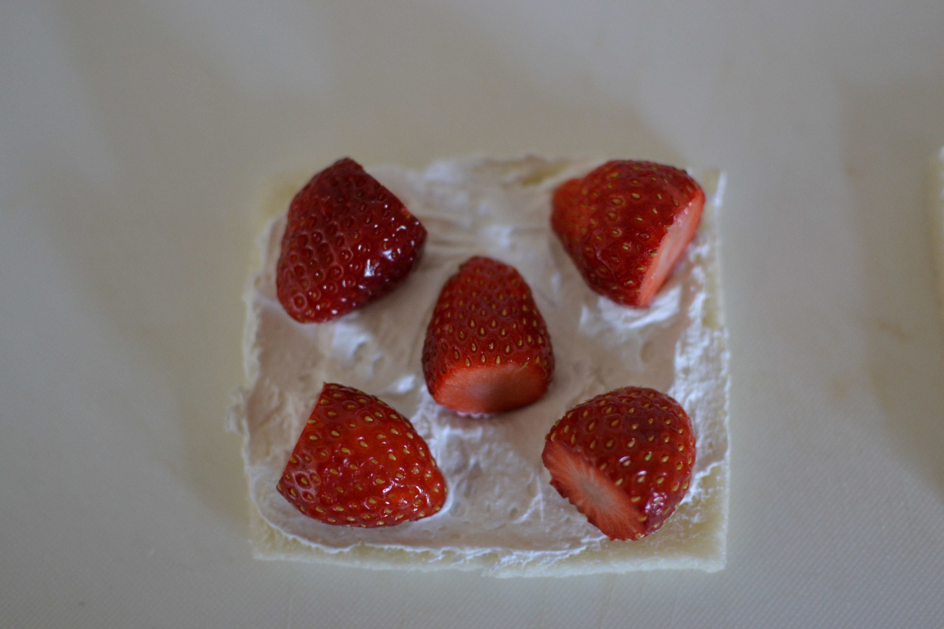 1.食パンの耳をカットし、グラニュー糖と練乳を入れて固めにホイップした生クリームを塗る。