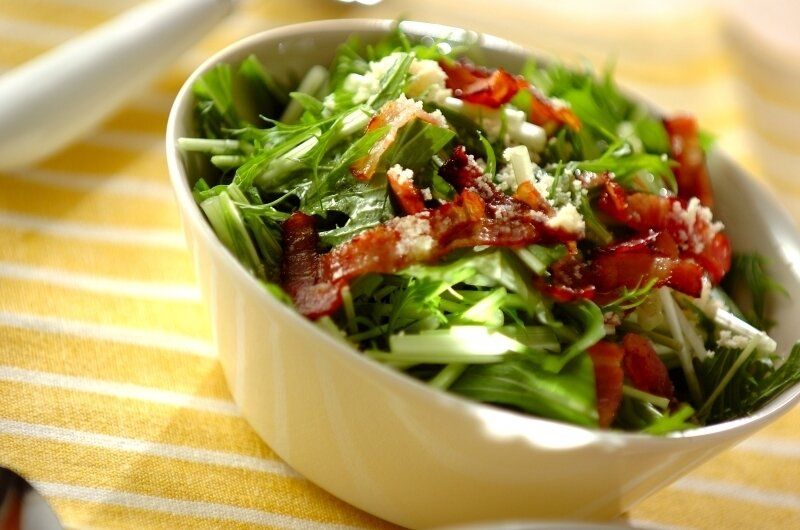 カリカリ食感のベーコンと水菜という、食感、相性ともにバッチリな組み合わせのサラダです。