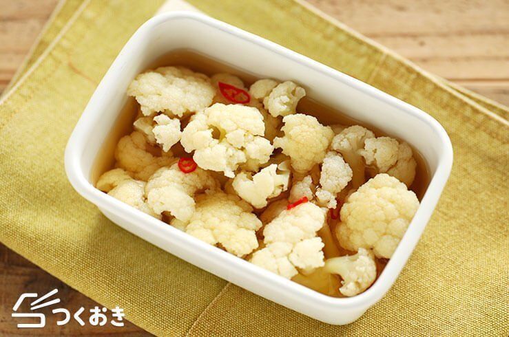 お弁当や小皿にぴったり、カリフラワーの和風ピクルスのレシピです。白だしと砂糖を加えることによって酸味がまろやかになり、また、ふわっと旨味も感じて食べやすい味に仕上がっています。