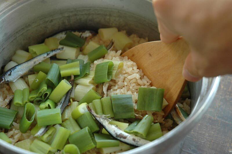 ねぎの甘味とうまみがご飯に染み込んでいて、食感も彩りも楽しい炊き込みご飯です。煮干しといっしょに炊き込むことで簡単においしい出汁を効かせることができます。
