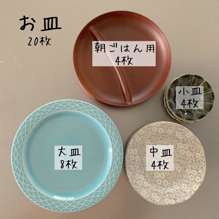 大皿8枚は多すぎる気もしますが、とても気に入っていて使うたびに色を変えて楽しんでいるので、よしとしています。お客様用の食器はありません。気に入って大切に使っている食器なので、どなたにも使っていただいています(お客様といっても親しい友人や親戚しか来ませんが)。