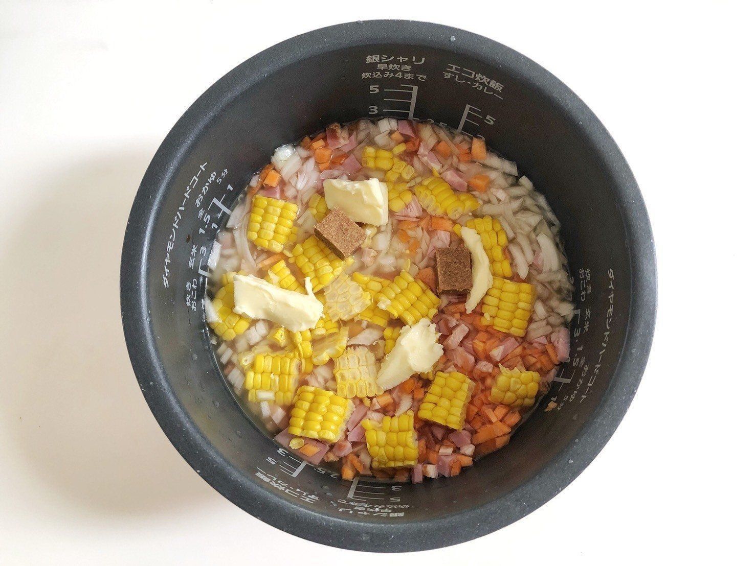 玉ねぎ、人参などの根菜はもちろんのこと、お肉の中でもベーコンは賞味期限が長めです。とうもろこしは、今回は生のものを使用していますが、缶詰のもので問題なし!