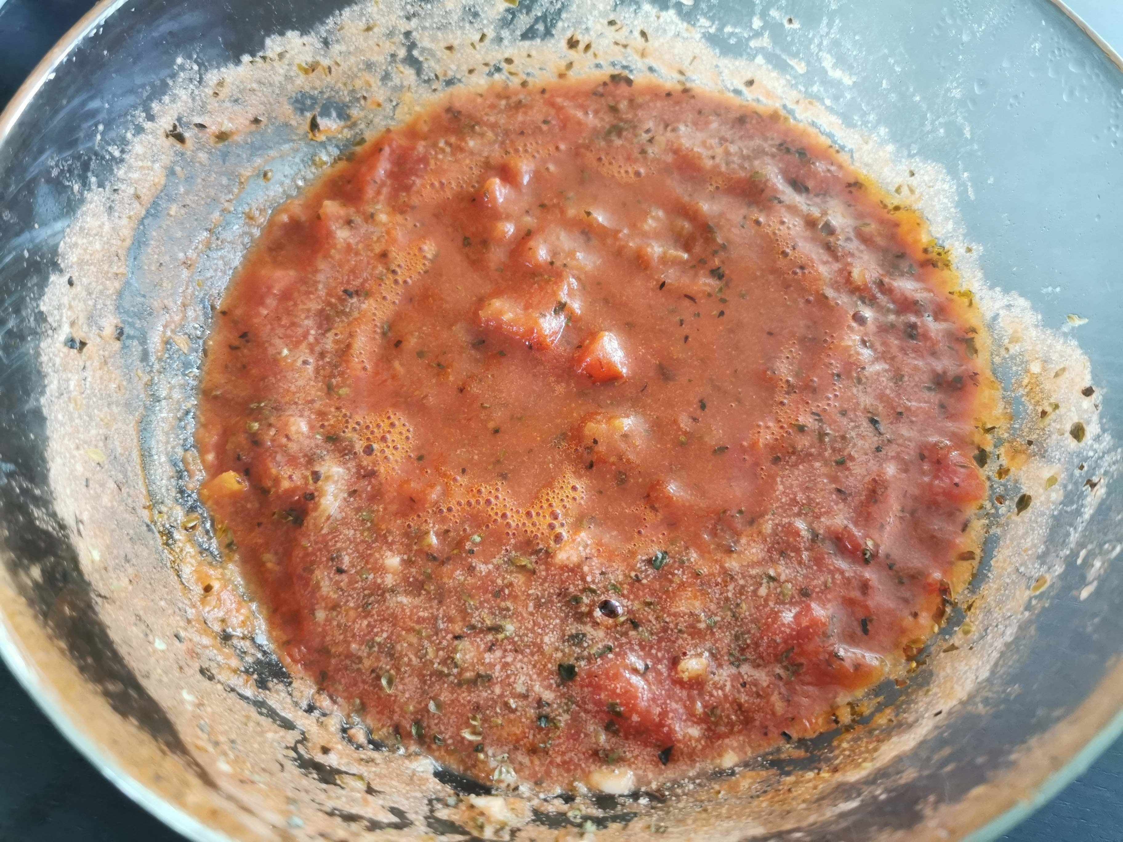 (2)カットトマト缶、フライドオニオン、粉チーズ、すりおろしたニンニク、オレガノをすべて混ぜ合わせ、ラップをしないで700wで8分加熱する。