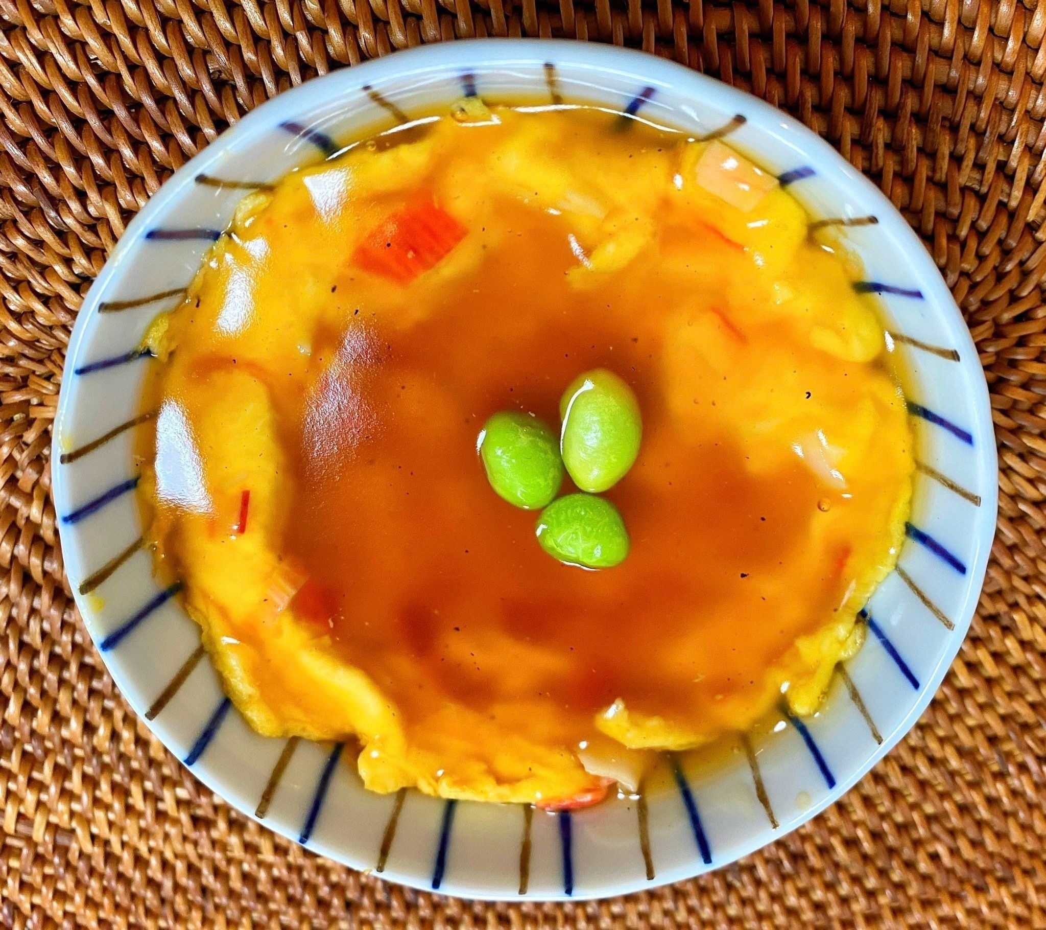 4.2に3をかける。枝豆とカニカマを飾ってできあがり。