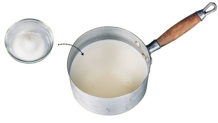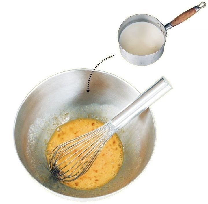 鍋に、牛乳、グラニュー糖の半量を入れて中火にかけ、ゴムべらで混ぜながら温め、沸騰直前で火を止める。