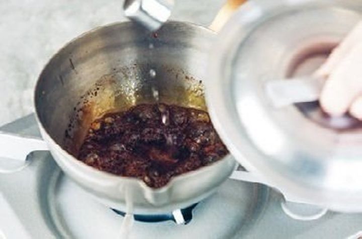 至福のプリンに欠かせないほろ苦ソース。熱湯を入れて色を止める際に跳ねるので、ふたを盾にしながら加えるのがおすすめ。あめ色が濃いほど、大人味になる。