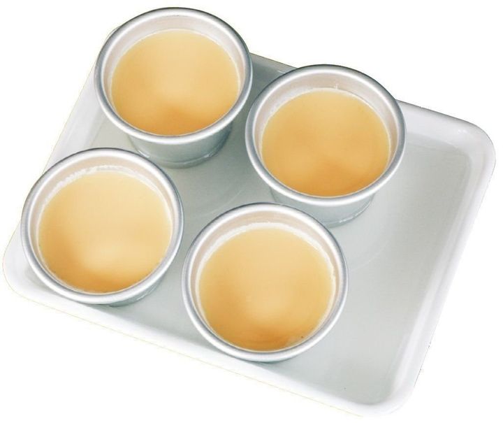 耐熱のバットに厚手のペーパータオルを敷き、(2)の型をすき間なく並べる。型の高さの1/3くらいまで湯を注ぎ、バットごとオーブンに入れて約30分焼く(竹串をそっと刺してにごった液が出なければOK)。取り出してさまし、粗熱が取れたら冷蔵室で冷やす。固まったら型の周囲にぐるりとナイフなどをそわせて入れ、皿をかぶせてひっくり返し、型からはずす。