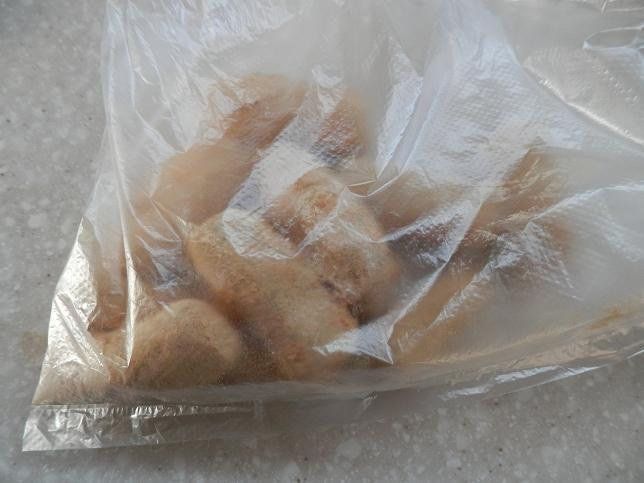 5㎝位の長さに切りそろえたら、きな粉と一緒にポリ袋に入れて振り混ぜます。ポリ袋を使うと薄くまんべんなくきな粉をまぶせることができますよ!